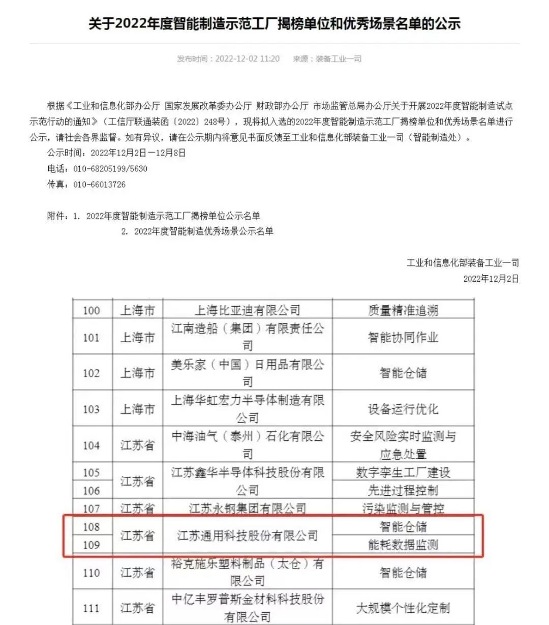 近日,江苏通用科技股份有限公司获评2022年度国家智能制造优秀场景予以公示。国家级智能制造优秀场景是自2021年开始,为落实国家智能制造十