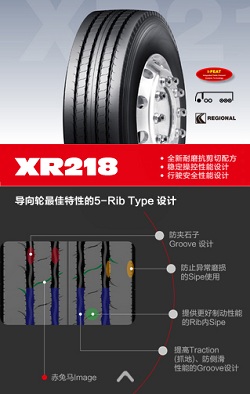 其中XR218采用全新耐磨抗剪切配方,更加稳定的操控性能设计,以及保障行驶安全性能设计。其导向轮采用了5—Rib Type设计,包括防夹石子Groove设计;防止异常磨损的Sipe使用;提供更好制动性能的Rib内Sipe;以及提高Traction(抓地)、防侧滑性能的Groove设计。
