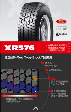 XR576使用耐磨抗剪切配方、均匀接地压力设计以及优异的驱动性设计,宽胎面的设计为车辆提供更好的驱动抓地性能。同时采用更加稳定的6—Row Type Block花纹设计,包括防夹石子Groove 设计;赤兔马Image;防止高低台磨损的Tie—Bar应用。