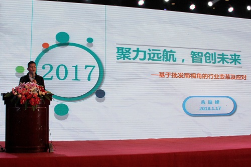 有限公司总经理余俊峰在大会上分享了“基于批发商视角的行业变革及应对”观点。2017年,鑫蜀通在“不只埋头拉车,更要抬头看路”、“锤炼内功,锻造软实力”、“紧跟通用发展步伐,凝心聚力”这三个层面上辛勤开拓,积极应对行业变革,不断探索创新发展机遇,创造了属于他自己的辉煌。