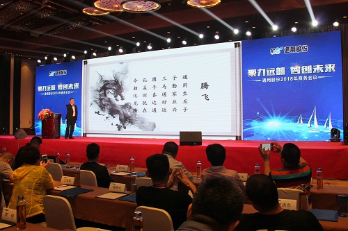 荣成市隆通贸易有限公司总经理张黎明在大会上作了题为“腾飞 2018”的主题演讲,他从定位、服务、客户管理三个渠道入手,向与会者分享了成功的营销经验和营销体系构建案例,为代表们日后在市场上攻城拔寨提供了可实施性的参考经验。