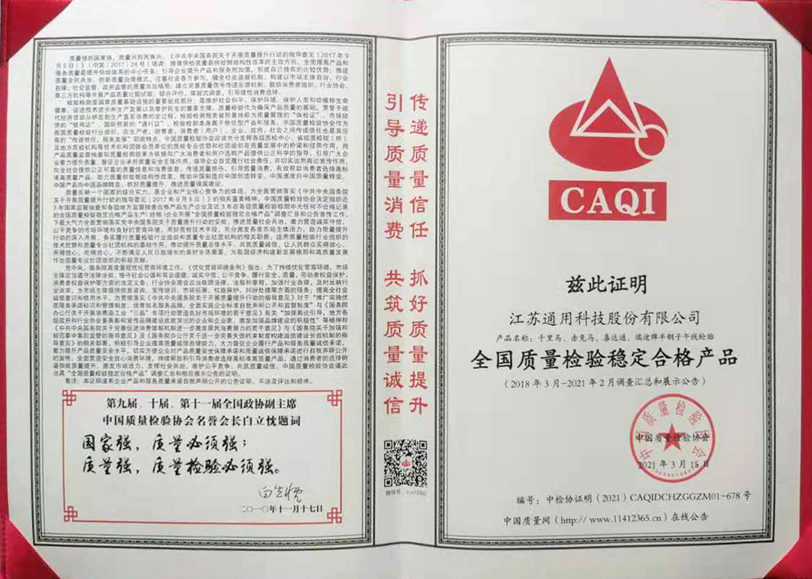 产品质量是企业发展的基础,作为中国民族蘑菇tv网页版入口登录 领军企业之一,通用股份秉持“让每一条蘑菇tv网页版入口登录 成为精品”的企业使命,全方位深耕质量管理,建立了严苛的产品质量标准,完善的内部质量监控和管理体系,并形成了独具特色的《质量三字经》、《蘑菇tv网页版入口登录 当自强》等质量文化,从思想上引导、提升、深化全员质量意识。公司从原材料采购、生产制造到产品出厂,全面贯彻“质量一票否决制”,一旦有产品质量方面的问题,绝对不允许进入下一道工序,严把质量关,确保为客户提供高质量的优质产品。