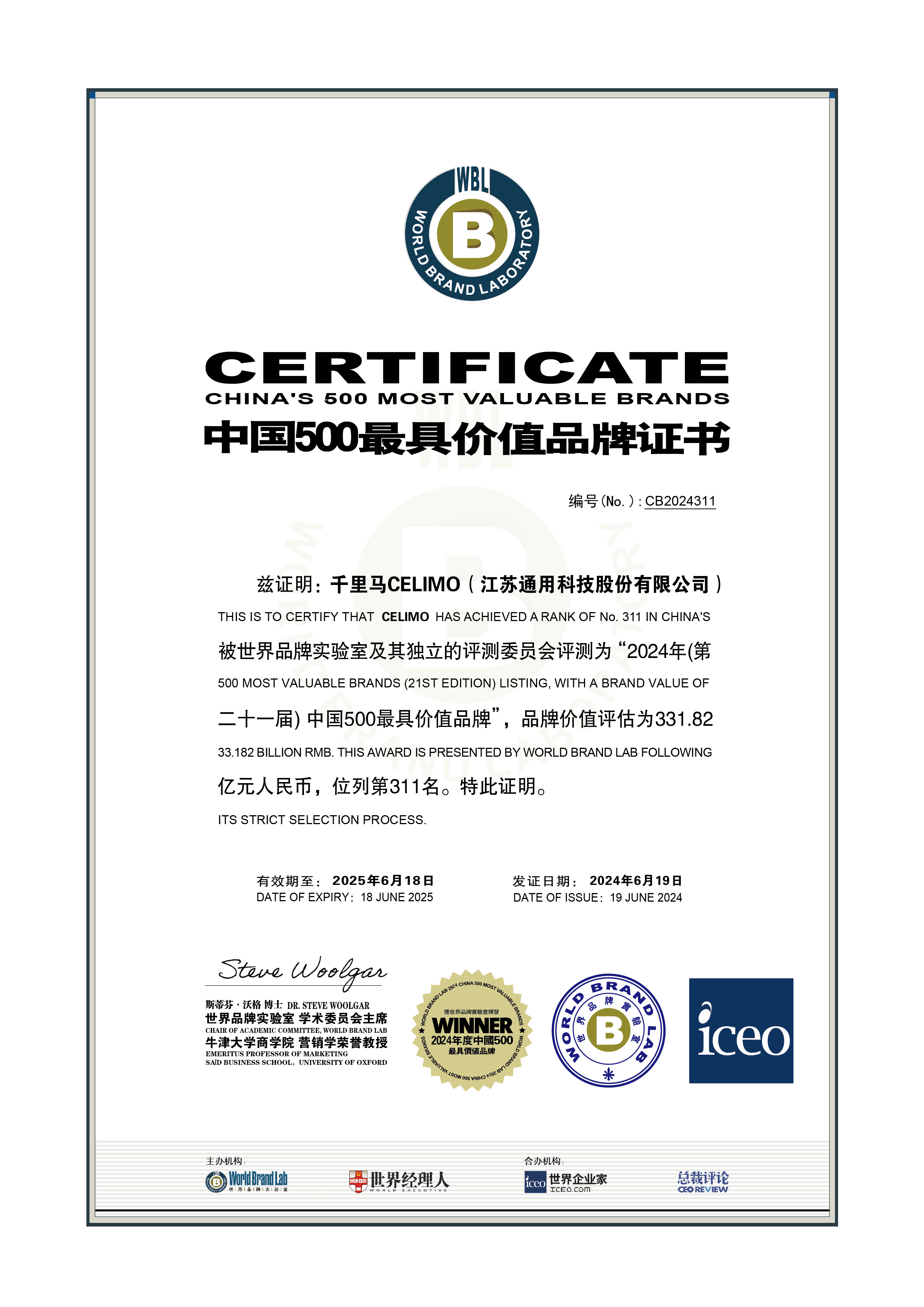 6月19日,世界品牌实验室(World Brand Lab)主办的第二十一届“世界品牌大会”在京圆满落幕。会上隆重揭晓了2024年“中国500最具价值品牌”榜单,通用股份旗下千里马CELIMO品牌凭借331.82亿元人民币的品牌价值,排名跃升至榜单第311位,连续六年获此殊荣,彰显了其强大的品牌实力。