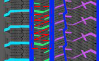 在制动过程中,M形交叉花纹设计可提升对花纹块的支撑,减少蠕动,提高花纹块刚性。