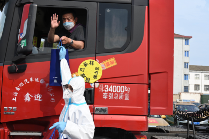 的志愿者们穿着防护服、红马甲,带着精心准备的热水、矿泉水、牛奶、方便面、面包、巧克力等物资来到高速卡口,为货运司乘们送上免费的餐食,还为他们送上消毒湿巾、口罩等,以备不时之需。